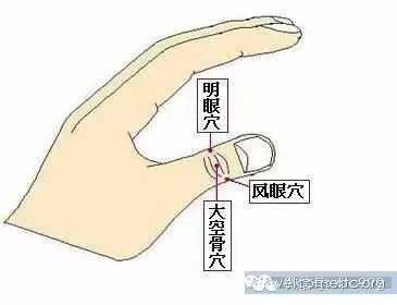 在我们的拇指上有三个相邻接的穴道,分别是明眼、凤眼、大空骨(如上图)。